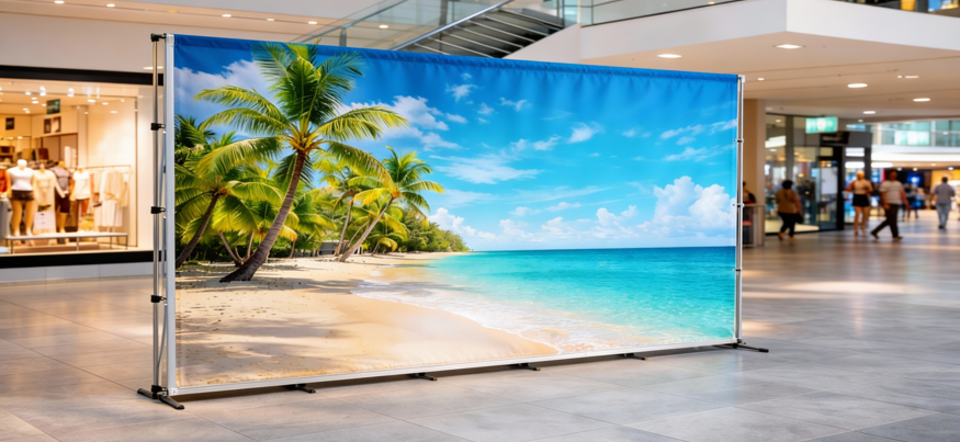 Photocall en lona Frontlit de 510 g, resistente al agua y al sol, con colores nítidos y duraderos. Impreso con tintas UVI para uso profesional.