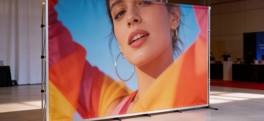 Photocall en lona Frontlit de 510 g, resistente al agua y al sol, con colores nítidos y duraderos. Impreso con tintas UVI para uso profesional.
