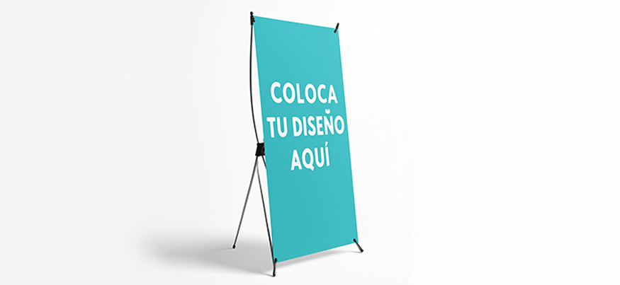 X-Banner impreso en lona Frontlit de 510 g, resistente al sol y la humedad, con colores vivos y duraderos. Incluye estructura ligera en “X”, fácil de montar y transportar, ideal para ferias, eventos y publicidad portátil.